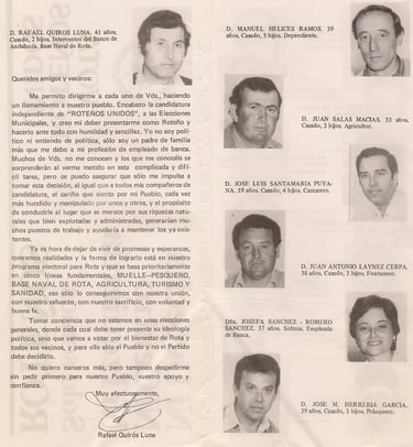 LOS PUESTOS DE TRABAJO DE LA BASE NAVAL. Esta iniciativa contó con el respaldo mayoritario de los roteños que recorrieron las calles de nuestro pueblo la plaza del Triunfo donde Horario Rodríguez dio lectura a un manifiesto de rechazo a los despidos en el recinto militar y de la Marcha a Rota contra las Bases. El primer hogar del grupo municipal y primera sede se ubicó en la Avenida de la Marina nº 12, permaneciendo hasta 1985, para mas tarde pasar a la calle Ruiz de Velarde, donde estuvimos hasta 1987. En ese mismo año se celebraban elecciones municipales concurriendo a los comicios electorales con una candidatura que encabezaba Juan Reales Román y formada por ciudadanos de un amplio sector social de la población: comerciantes, autónomos, empleados, profesores, hosteleros, marineros…